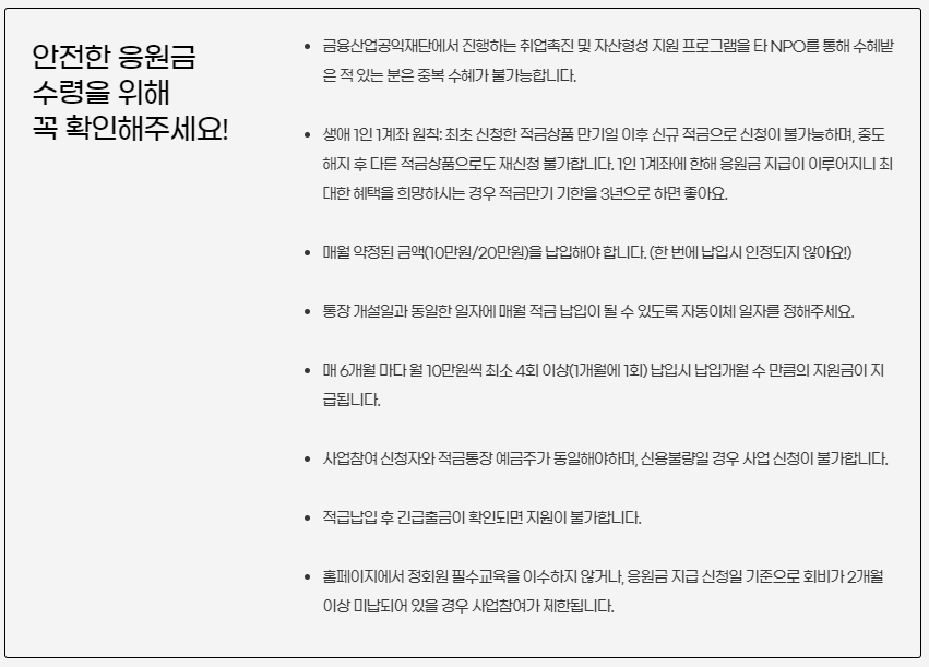 위 주의사항은 반드시 빠짐없이 확인해서 모두 만기까지 응원금을 받을 수 있도록 힘내보아요!